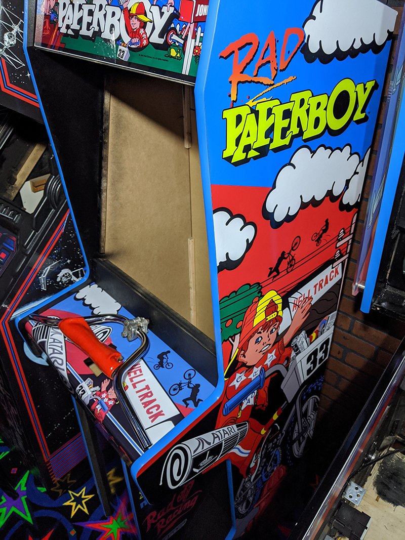 I ended up selling the cabinet empty but ill build another eventually. My plan is to use actual BMX handlebars inside a 3d printed case housing a usb star wars yoke inside. I would limit it to only turn left and right. I still have the handlebars and a 3d printed piece that houses a tiny arcade button to throw the papers.
